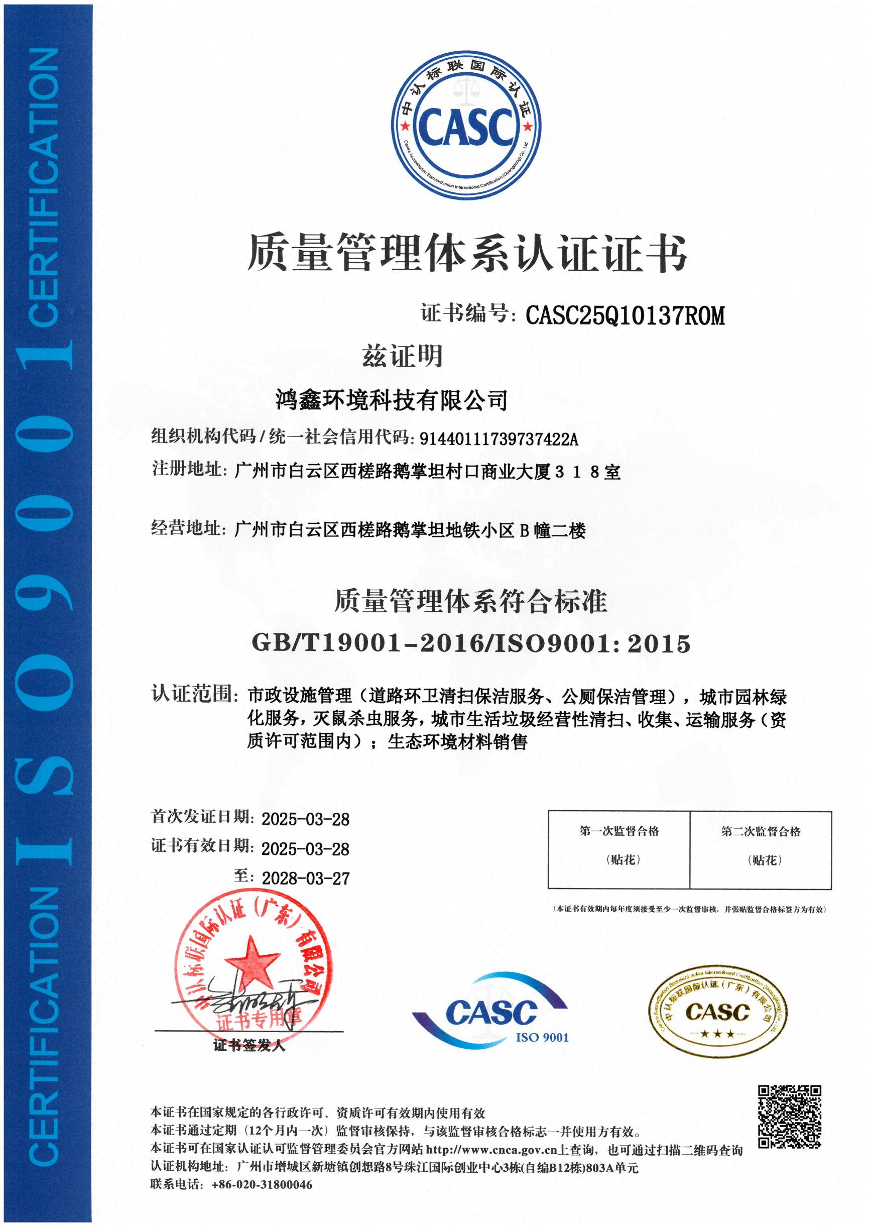 质量管理体系认证证书