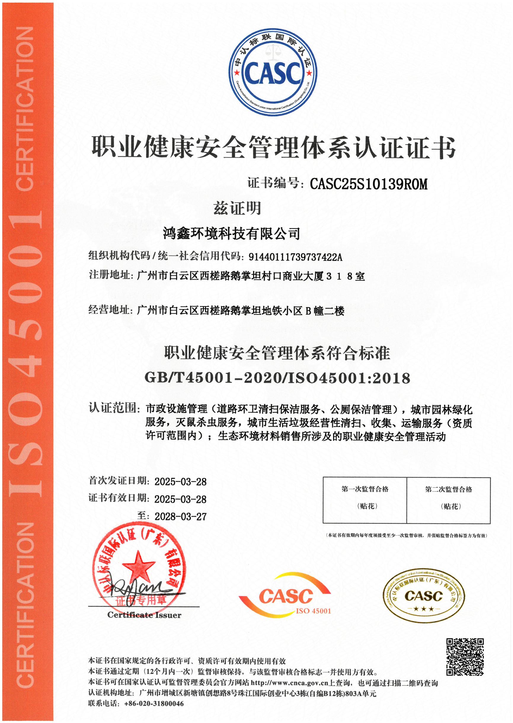 职业健康安全管理体系认证证书