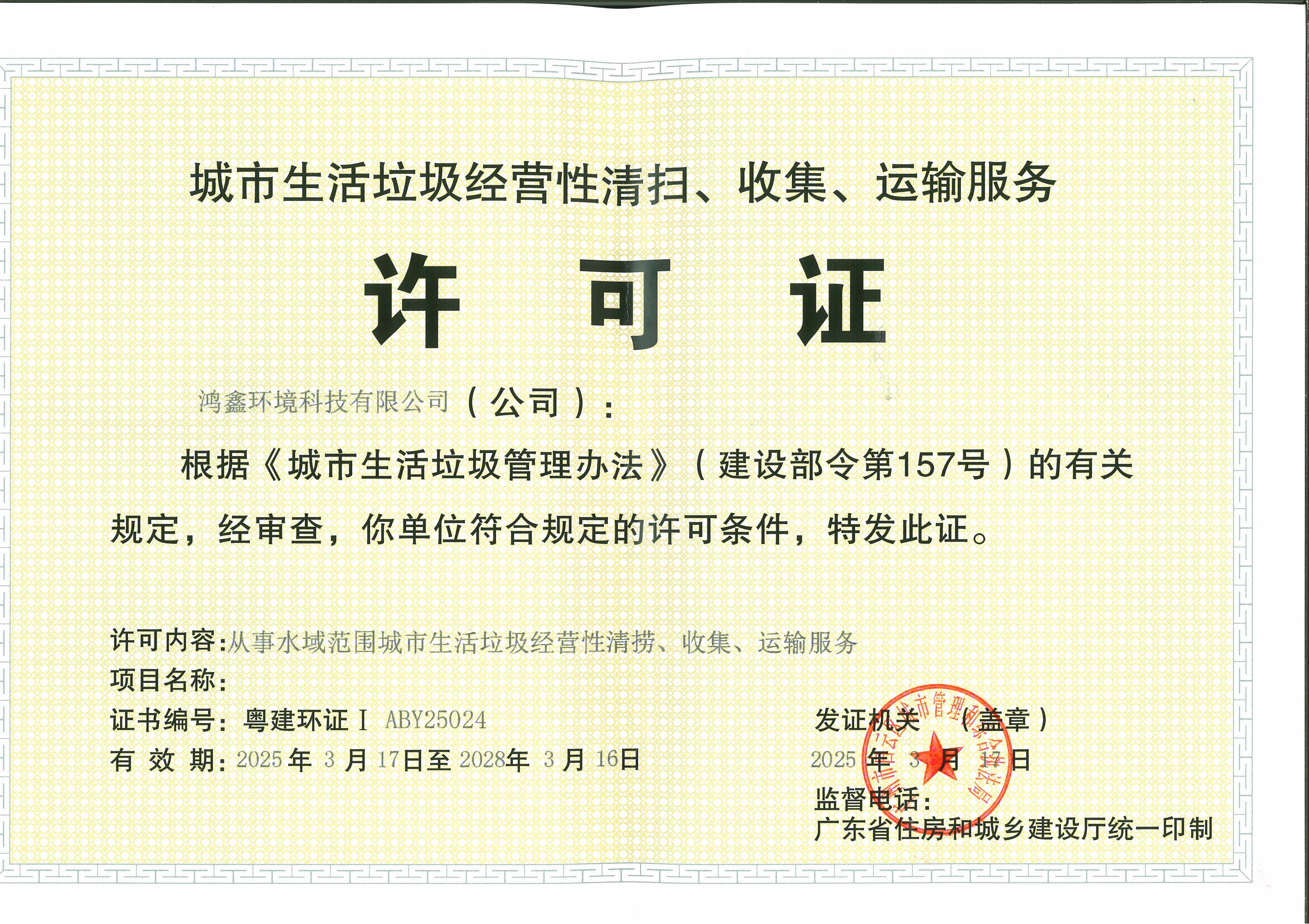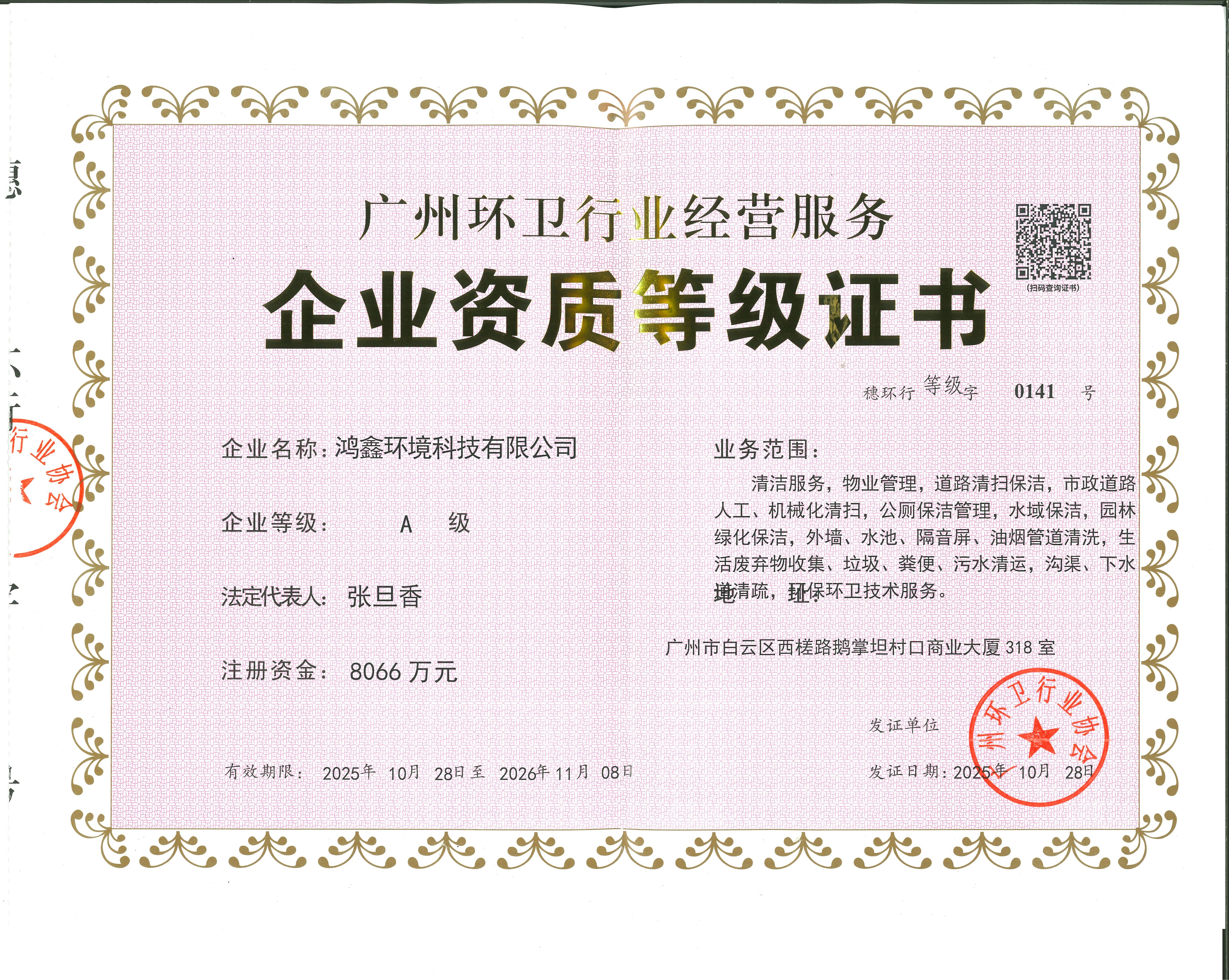 广州环卫行业经营服务资质等级证书