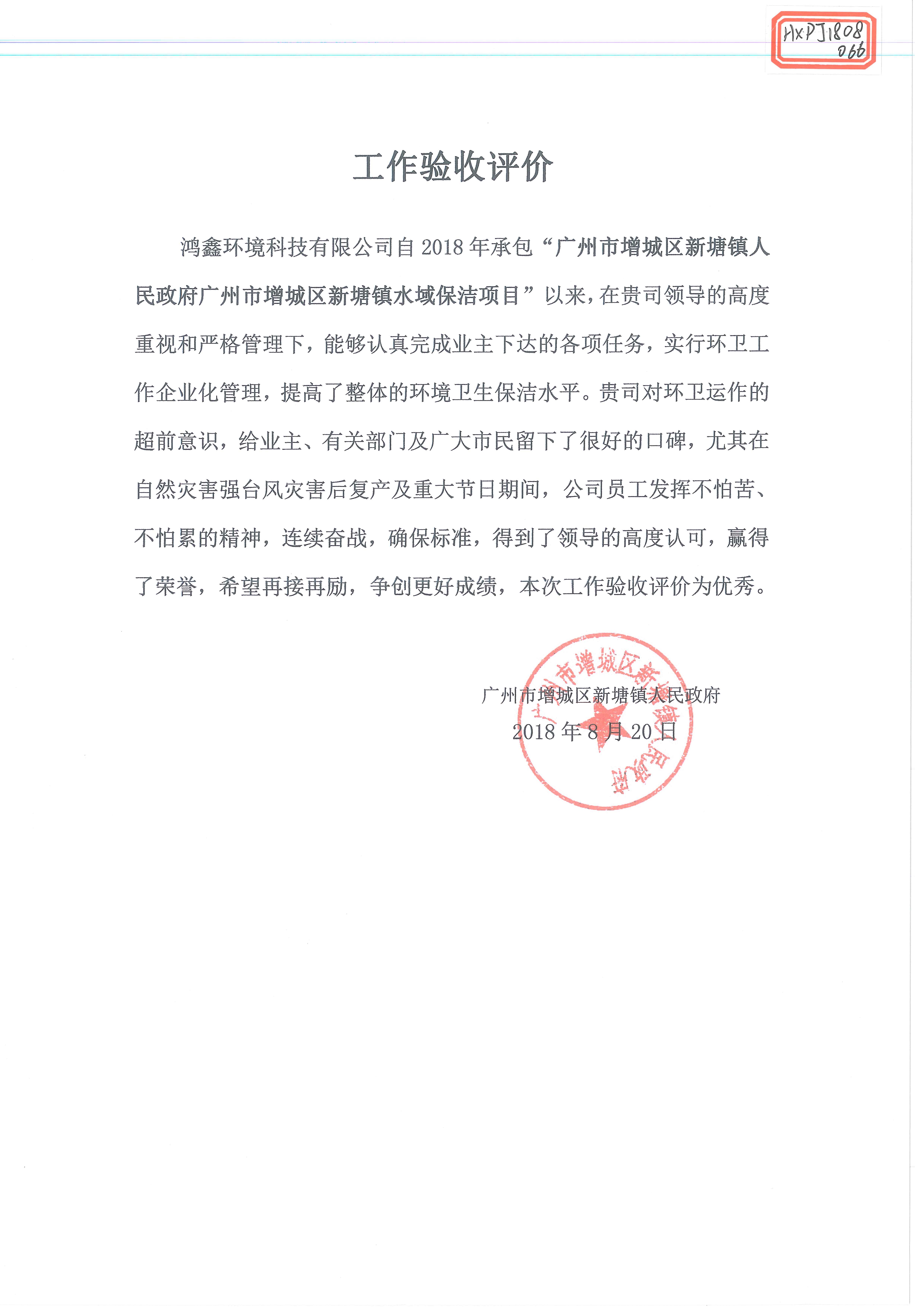 广州市增城区新塘镇水域保洁工作评价(2018年8月)