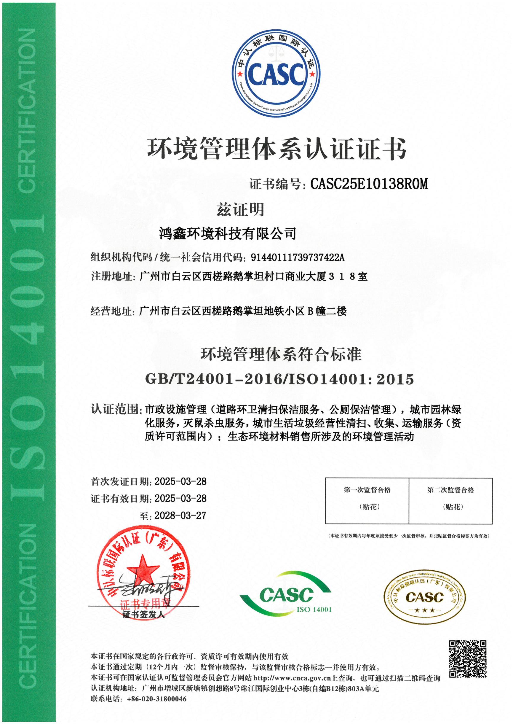 环境管理体系认证证书