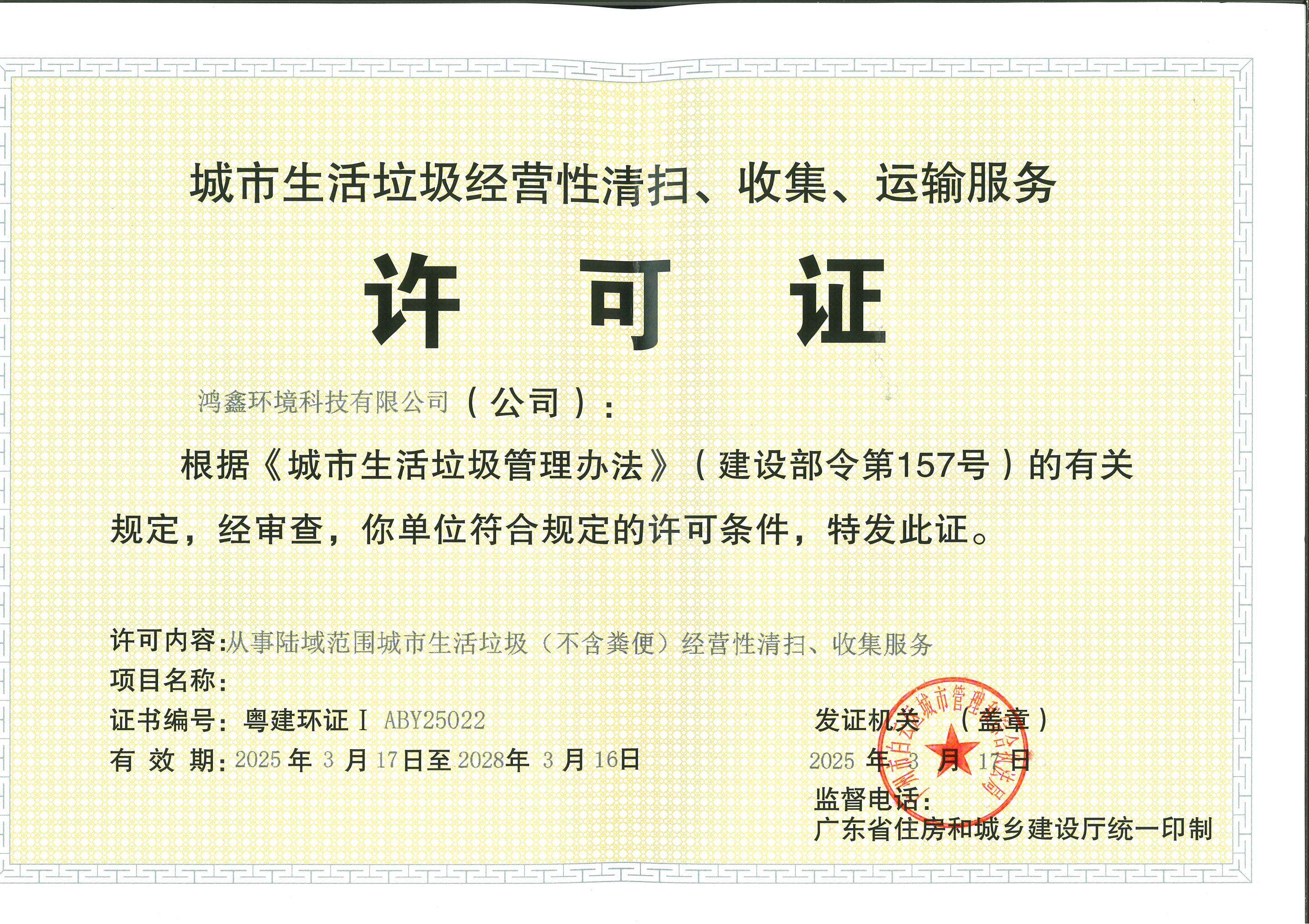 广州环卫行业经营服务资质等级证书
